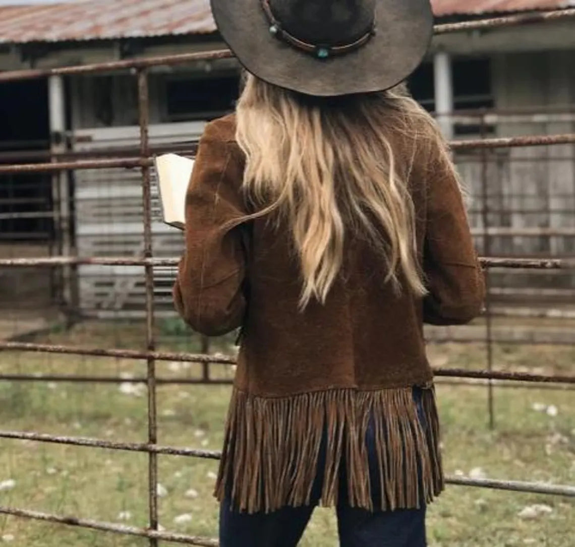 Channel effortless Western charm with this boho-inspired brown fringe jacket. Designed with a suede-like texture, long fringe trim, and tie-front closure, this piece is a staple for cowgirls, festival-goers, and vintage lovers alike. The handcrafted aesthetic and rustic vibe make it ideal for rodeos, country concerts, ranch days, or styled photoshoots. Featuring decorative metal eyelets and hanging leather-style cords, the jacket blends rugged Western roots with feminine flair. Lightweight yet statement-making, it's the perfect layering piece for spring or fall. A must-have for those chasing sunsets and cowboy dreams. Limited pieces available – saddle up and add this to your collection today!