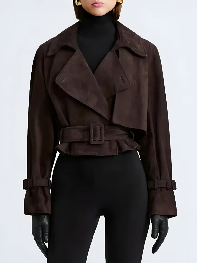 Elevate your fall and winter wardrobe with this chic brown suede jacket. Designed with a contemporary cropped fit, this belted outerwear piece combines timeless elegance with modern sophistication. Featuring a sharp collar, belted waist for a flattering silhouette, and stylish cuff details, this jacket is perfect for layering over your favorite turtleneck or dress. Ideal for both casual and dressed-up looks, it's a versatile addition to any fashion-forward closet.