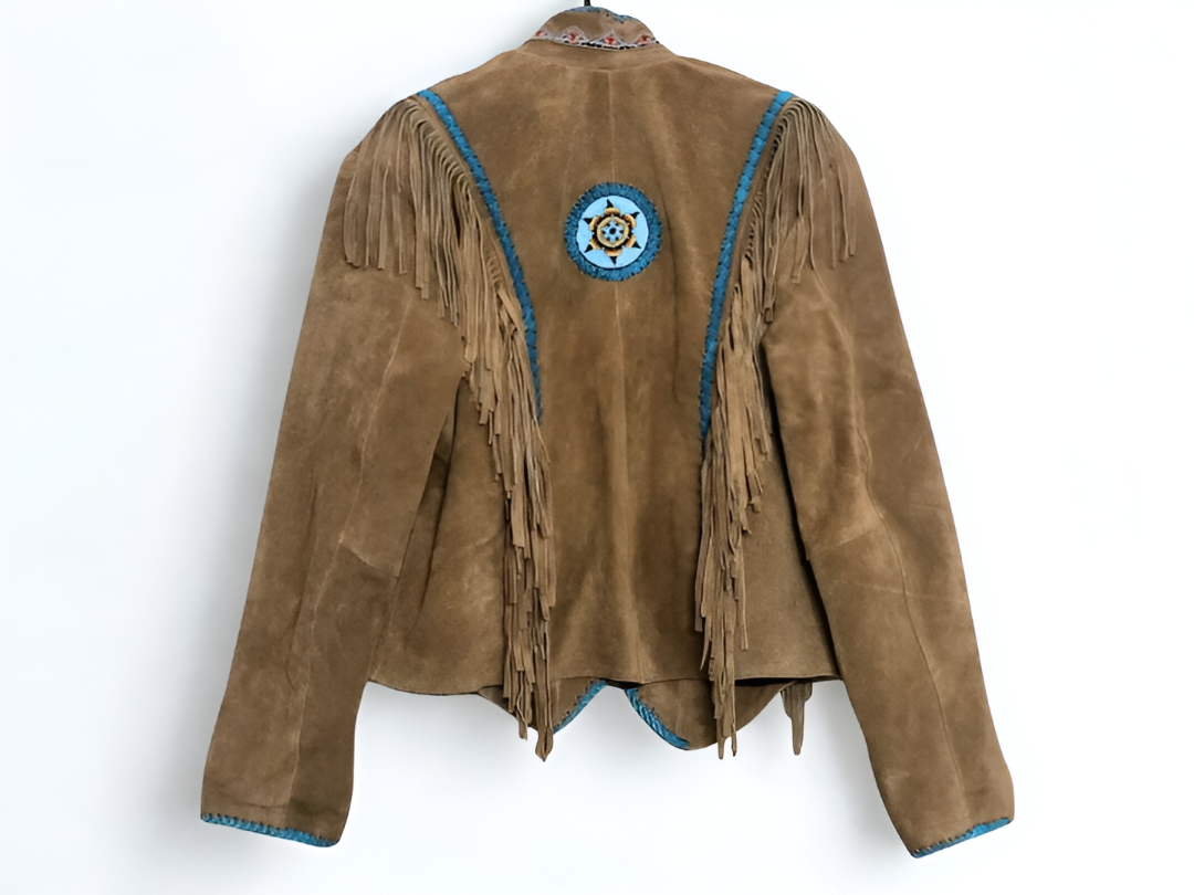 This handcrafted suede fringe jacket blends Western charm with bohemian artistry. Featuring intricate embroidered tribal patterns in vibrant colors, it adds a bold statement to any outfit. Soft suede material offers comfort and durability, while fringe accents on the sleeves and sides bring free-spirited movement. Perfect for festivals, concerts, or everyday boho style, this jacket pairs effortlessly with jeans, boots, or skirts for a unique and timeless look.