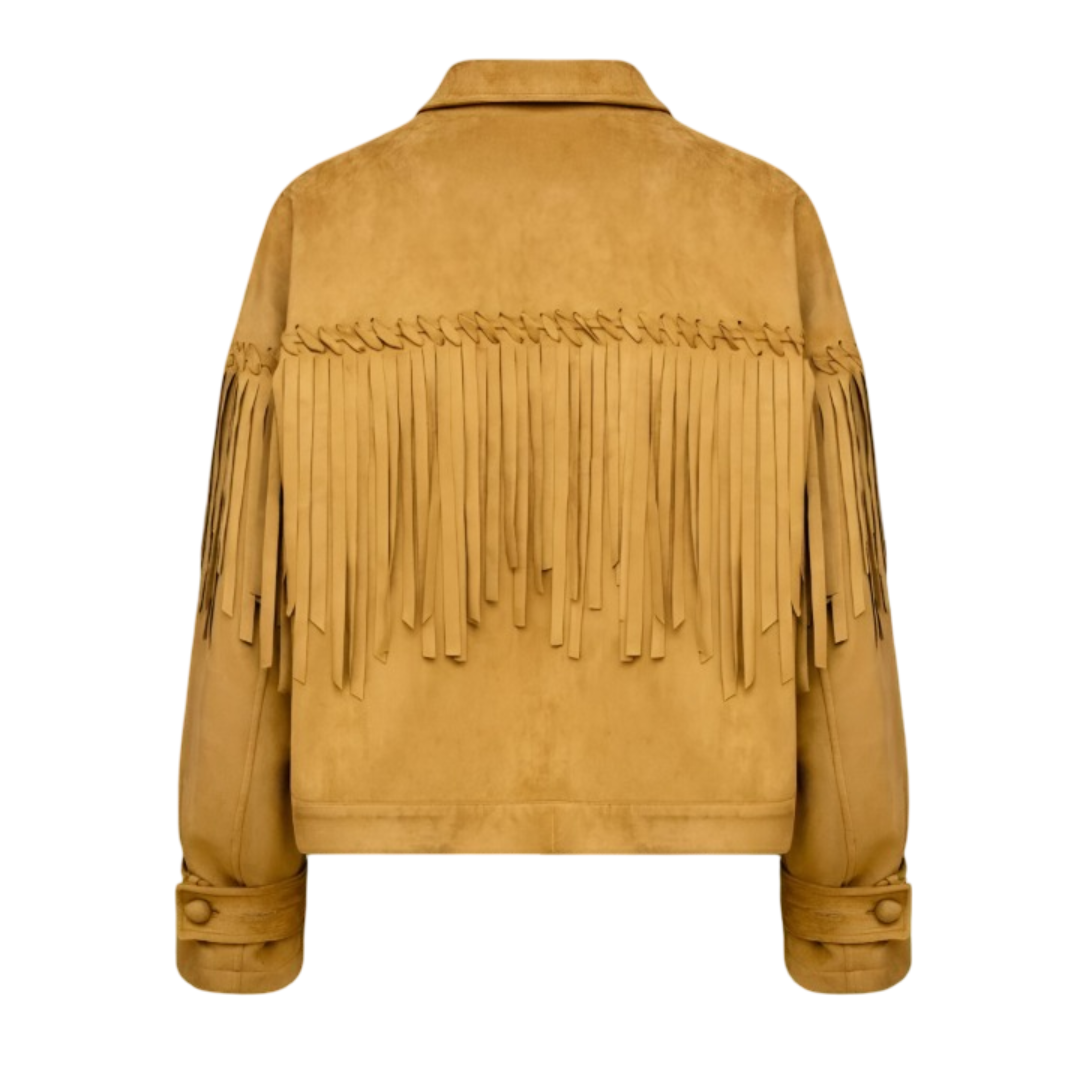 This Women’s Tan Suede Fringe Jacket — a chic blend of western heritage and modern fashion. Crafted from 100% genuine suede leather, it delivers a luxuriously soft feel and premium durability. Designed with long, flowing fringes across the chest, back, and sleeves, this jacket captures the authentic spirit of classic cowgirl style. The structured silhouette features a shirt-style collar, front button closure, and two functional front pockets for a practical yet stylish touch. The smooth inner lining ensures comfort, while adjustable sleeve straps allow for a tailored fit. Perfect for concerts, festivals, and casual outings, this jacket pairs effortlessly with denim or dresses for a trendy, free-spirited look. Every stitch and fringe is carefully crafted for lasting quality and standout appeal. Elevate your wardrobe with this western-inspired suede fringe jacket — a statement piece that celebrates confidence, individuality, and timeless design.